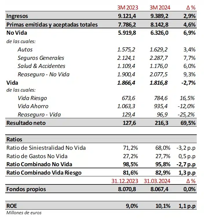 - Las primas crecen un 4,6%, hasta alcanzar más de 8.100 millones, mientras que los ingresos se sitúan cerca de 9.400 millones.