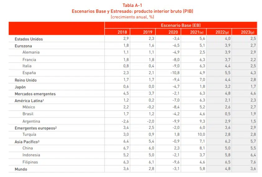 Además, esa inflación elevada, que seguirá siendo persistente, está empezando a influir sobre las decisiones de política monetaria y fiscal, con una respuesta más acelerada en los países emergentes. Ese endurecimiento de la política monetaria (acompañada de un servicio de la deuda sensible a este nuevo horizonte de menores compras de activos y tasas más altas) exacerba los temores de insostenibilidad y del retorno hacia medidas de austeridad que obstaculicen el desempeño económico. Y a esto se suma otro riesgo global que ha aumentado en los últimos meses, según los expertos: la gobernanza global y la crisis geopolítica, dado que a la desordenada salida de Afganistán y a la congelada relación con China en materia geopolítica y tecnológica, se suma el reciente desafío diplomático abierto en Rusia. Todo ello lleva a los expertos a reducir las previsiones sobre la economía mundial en una décima, del 4,9% al 4,8% para este año, en el escenario base, y contempla un avance del 3,6% para 2023.