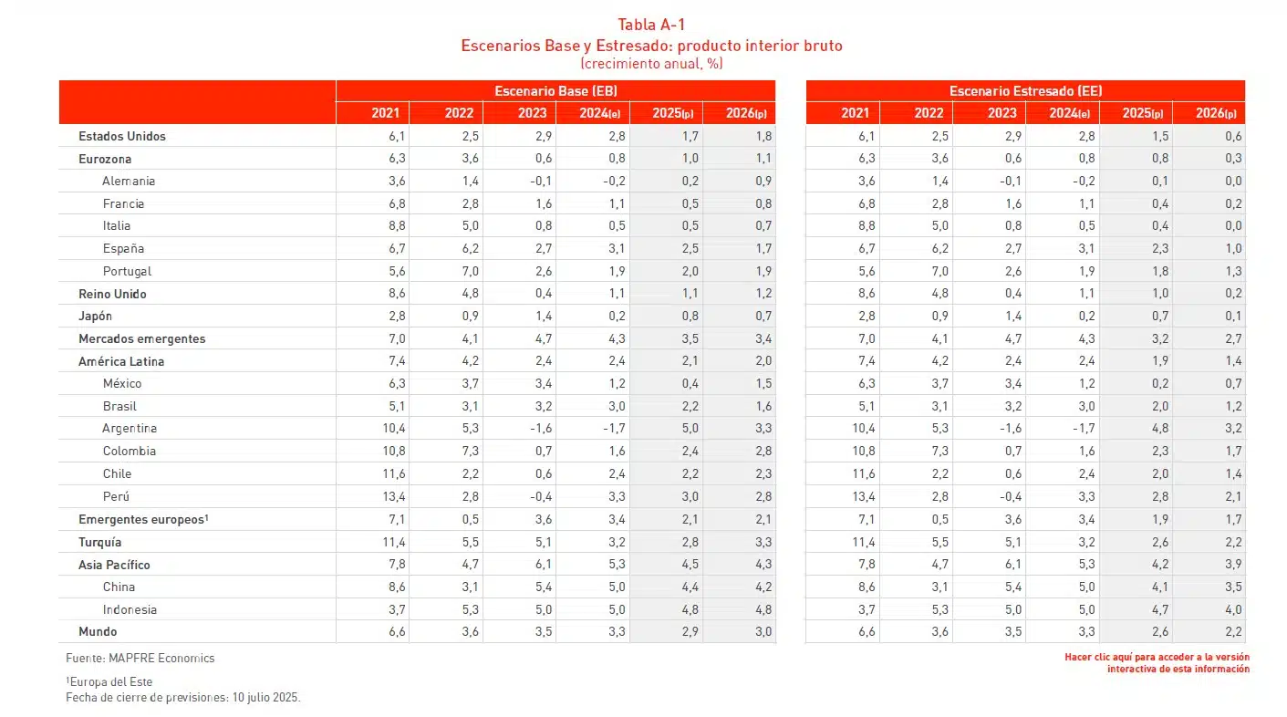 Mapfre Economics, el Servicio de Estudios de Mapfre, estima un crecimiento para la economía mundial del 2,9% este año, dos décimas más respecto a las previsiones de hace unos meses, y el 3% el que viene, con una inflación que se situará en el 3,4% y en el 2,9%, respectivamente, según el informe ‘Panorama Económico y Sectorial 2025: perspectivas hacia el segundo semestre’, editado por Fundación Mapfre.