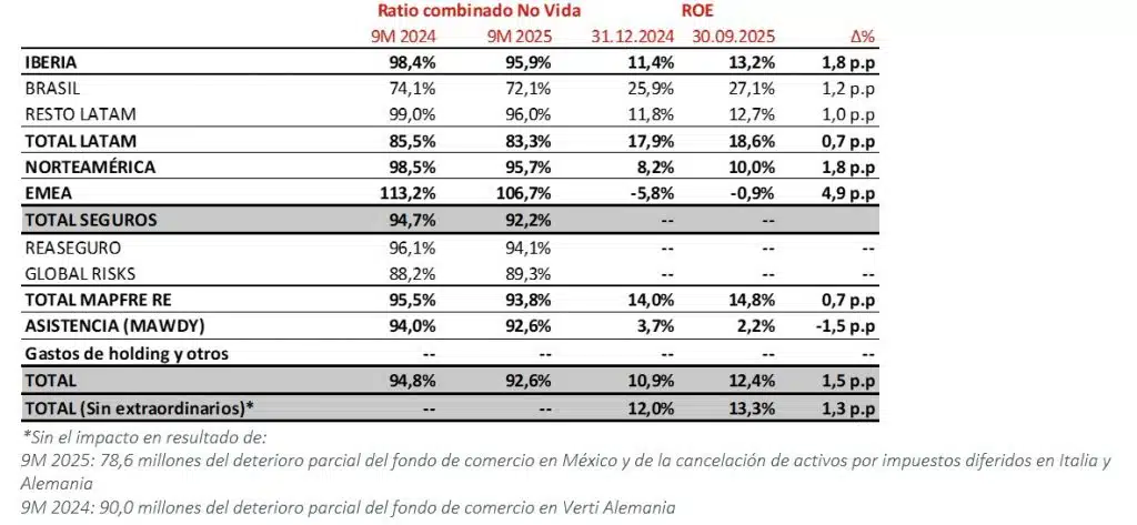 - Turquía y Malta siguen aportando positivamente, mientras Alemania e Italia reducen significativamente las pérdidas, mejorando el ratio combinado de la región hasta el 106,7% (desde el 113,2% en 9M 2024) y el resultado hasta los 7 millones (-19 millones en 9M 2024).