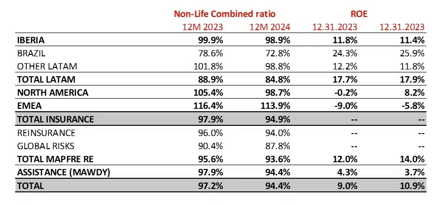 - The combined ratio improves to 93.6% (-2.0 p.p.). The most relevant weather events for Mapfre RE in the year were the floods in the Rio Grande do Sul region in Brazil and the storms in Europe. Prudence levels in provisions continue to be strengthened in response to uncertainty regarding weather events.