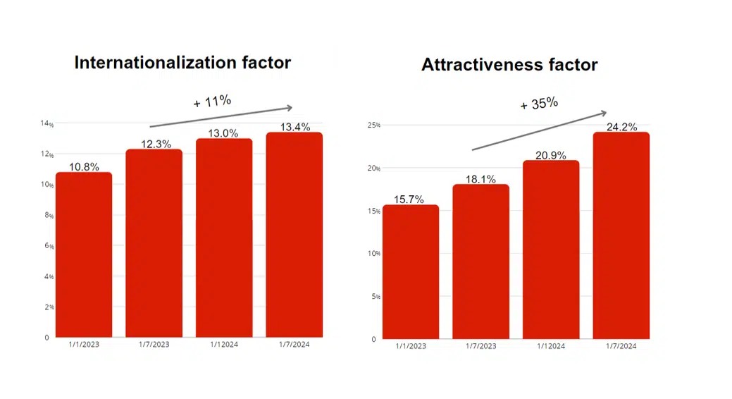 The attraction index for foreign companies is 24.2%, marking a 3.3-point increase from the beginning of the year when it was 20.9%. Analyzing the period from July 2023 to June 2024, inclusive, shows 35% growth (from 18.1% to 24.2%): on average, one in four insurtech startups in a given market is foreign.