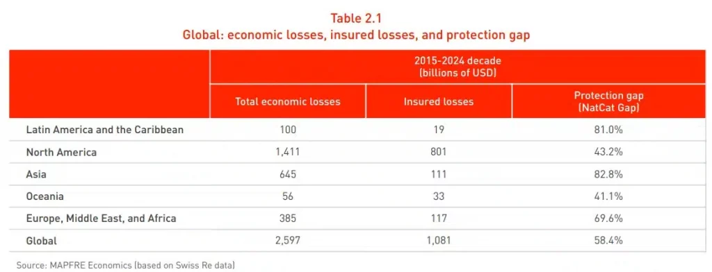 If the information is analyzed by region, taking the average of the last available decade (2015–2024), Asia is the region of the world with the largest insurance protection gap, with coverage of only 17.2% of total losses from natural catastrophe-related risks, representing a gap of 82.8%. Next is Latin America, which has an average gap of 81%. On the contrary, North America is the region that presents the smallest protection gap, with an average of 43.2% of losses not covered by insurance contracts.