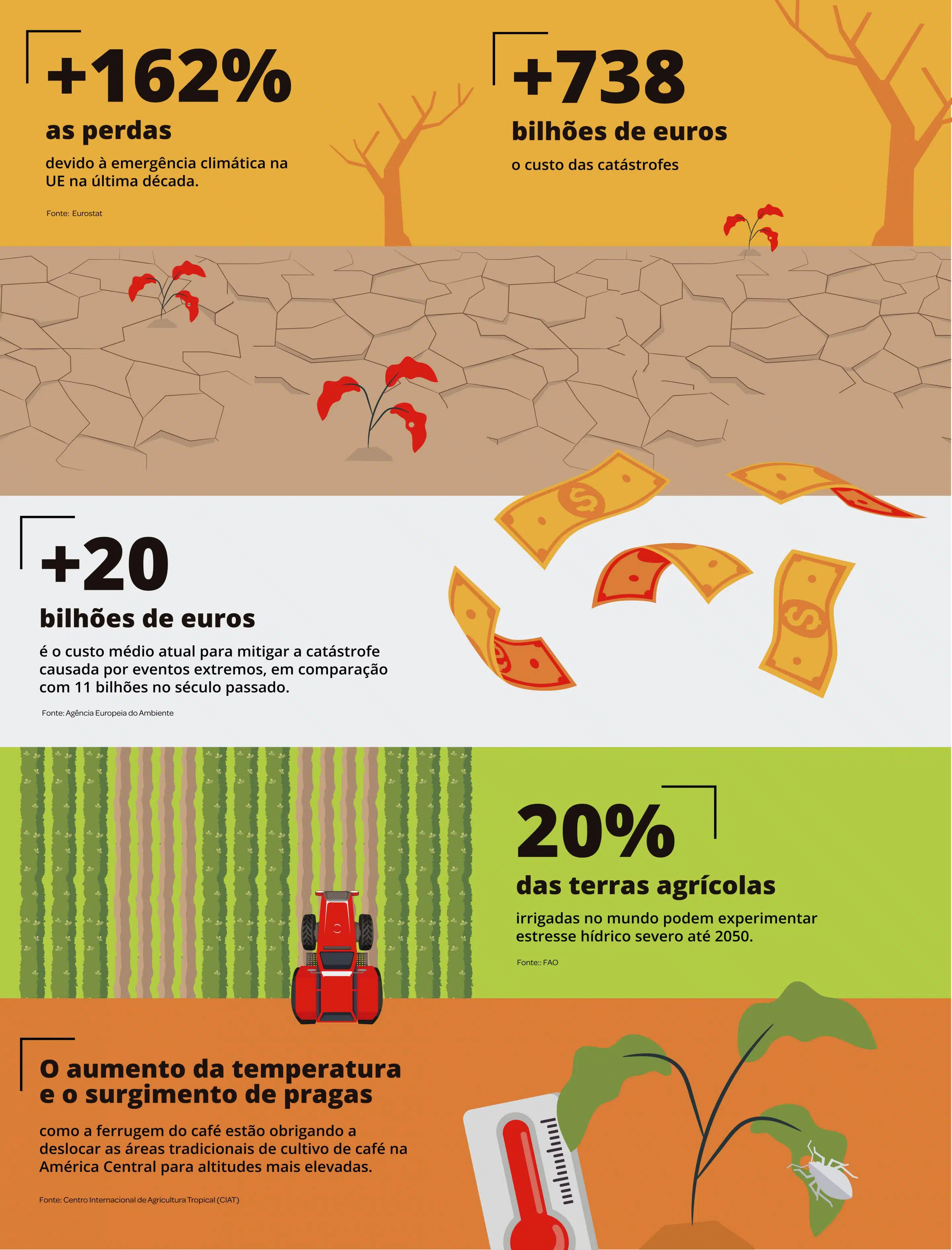 O campo, motor da segurança alimentar e sustento de muitas economias locais, está na linha de frente da exposição. Em países como Espanha, Itália, Argentina, Índia ou Estados Unidos, os efeitos das mudanças climáticas já se traduzem em perdas diretas para o produtor agrícola e pecuarista. Um relatório da Organização Meteorológica Mundial (OMM) confirma que o aquecimento global quebrou todos os recordes em 2024 e alerta que seus efeitos serão irreversíveis por séculos. Isso afetará as grandes produções industriais, mas também os pequenos e médios produtores, muitas vezes com pouca capacidade de recuperação.