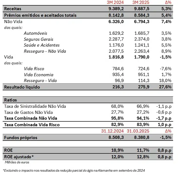 - O negócio de Automóveis registra uma melhoria técnica relevante, contribuindo com 51 milhões para o resultado (+64 milhões em relação ao primeiro trimestre de 2024).
