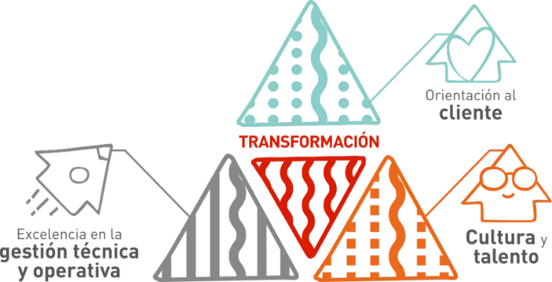 En base a la transformación que necesitamos como compañía, articulamos nuestra estrategia en tres pilares: orientación al cliente, excelencia en la gestión técnica y operativa y en la cultura y talento. La transformación estará presente en todo lo que hagamos, será transversal y actuará como auténtico acelerador en todos los ámbitos de la compañía.